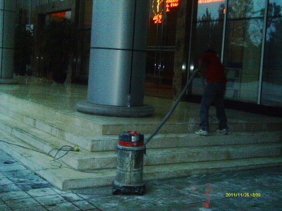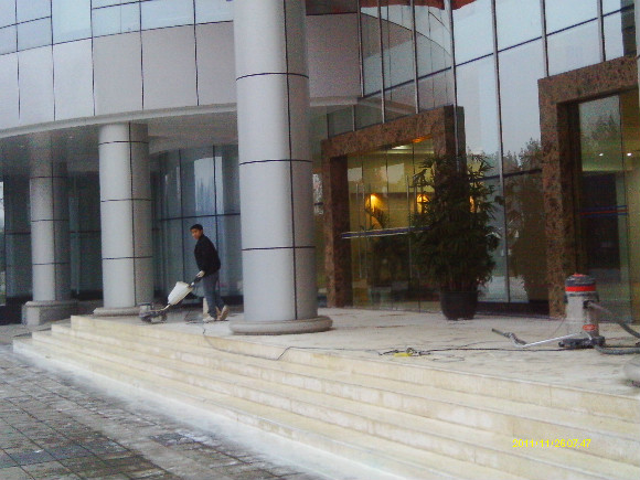 到了70年代末,一種可塑性水溶性結晶聚合物的誕生,亦即是現今常說的水蠟,進化了石材護理的歷史,可以利用這種物質對不同材質的大理石進行護理。分底蠟(封蠟),面蠟(拋光蠟)及保養蠟(日常修補蠟)是對大理石的塑層進行保護并利用高速拋光來增亮,對石材的保護起到一定的作用。但是這種水蠟不足之處是蠟層的硬度有限,稍欠保養,腳步帶進的塵土將很容易把蠟層及石材磨花。同時,遇上雨水季節,因室外雨水塵埃會有一定的雜質,通過人的腳步帶進后,對蠟層的分子組成將造成一定的影響。直觀看到是蠟層變黃及缺光澤,也就是以后常見到的許多客戶為什么須經常將腐蝕的蠟層用起蠟水脫去,再重新分工序打上底蠟和面蠟,每次的工作量及耗用的物料較大,這種工藝現市場上很普通,我們稱為石材打蠟第二代。